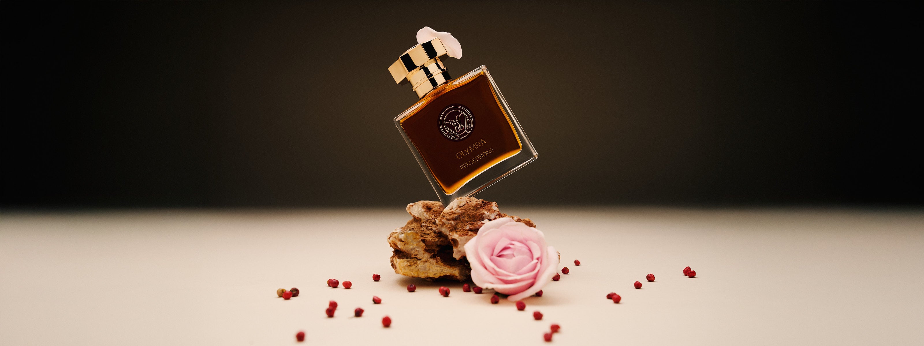 OLYMRA PERSEPHONE is a fragrance of dual worlds: one of light, one of shadow. Inspired by the mythic queen who walks between both, it captures a moment of transformation: the instant spring yields to desire, and dusk begins to bloom.